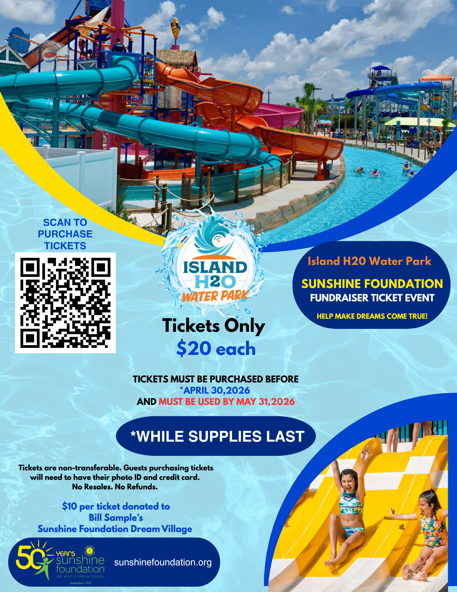 April 8-30, 2026-Kissimmee, FL-Island H20 Waterpark is hosting a fundraiser for the Sunshine Foundation. Enjoy a fun day at the waterpark while making dreams come true!