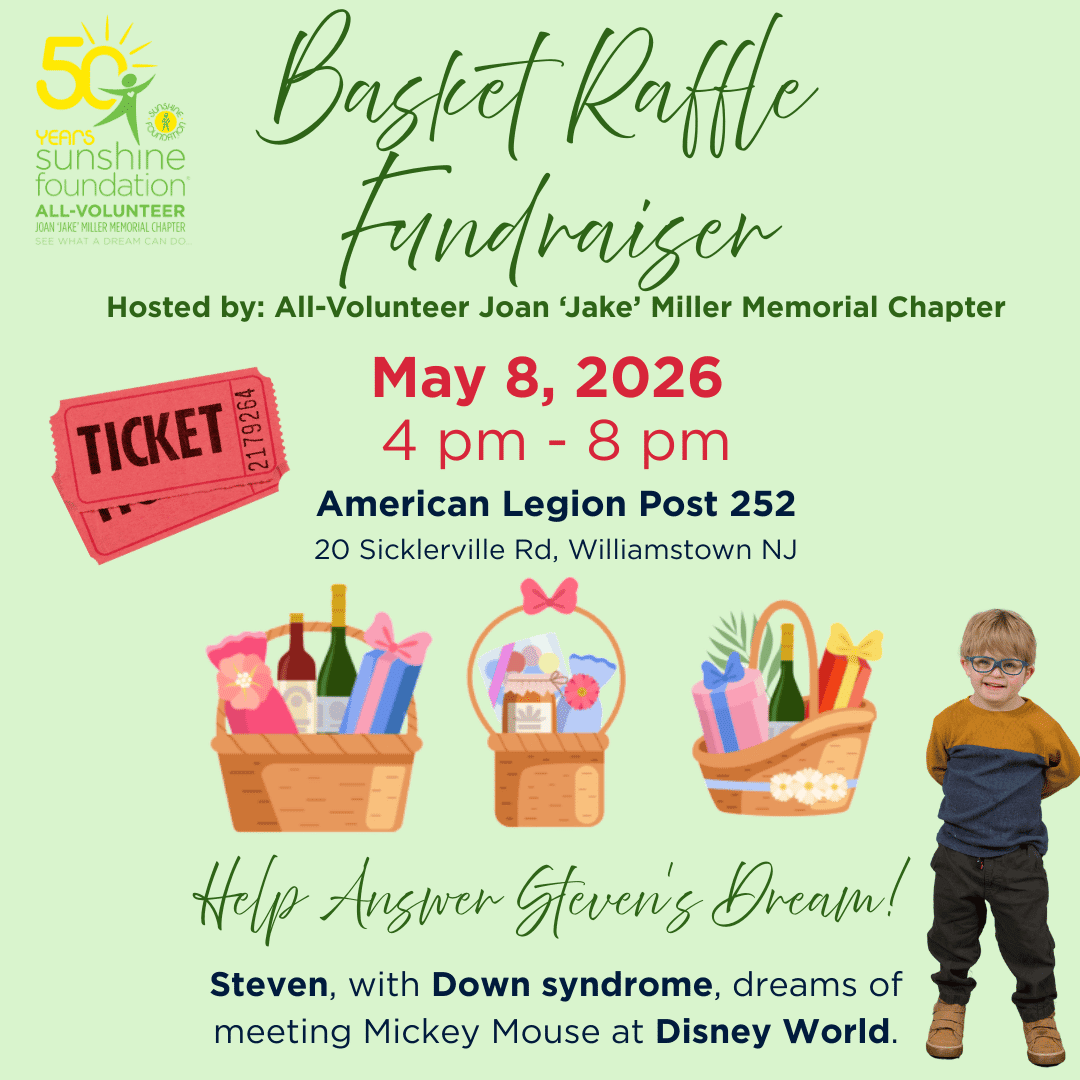Basket RaffleMay 8, 2026 – Williamstown, NJ – Join the Basket Raffle Fundraiser to help make Steven’s dreams come true!